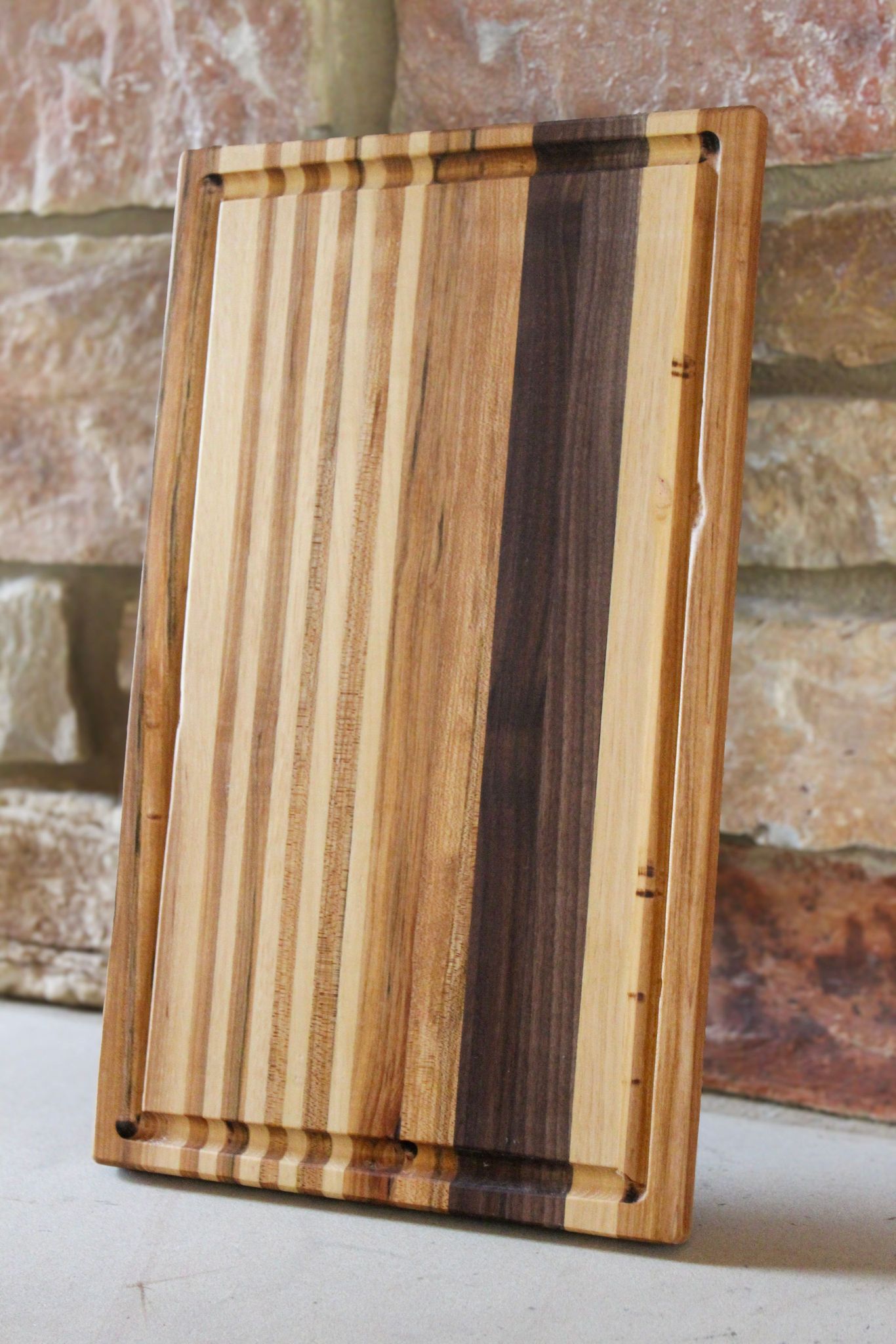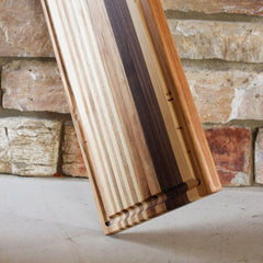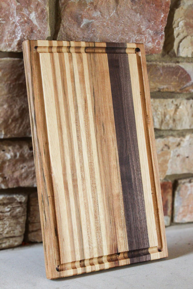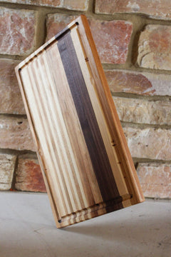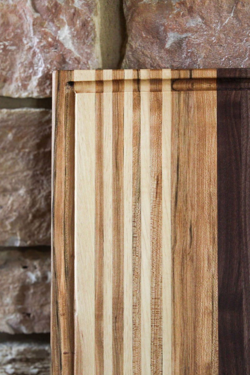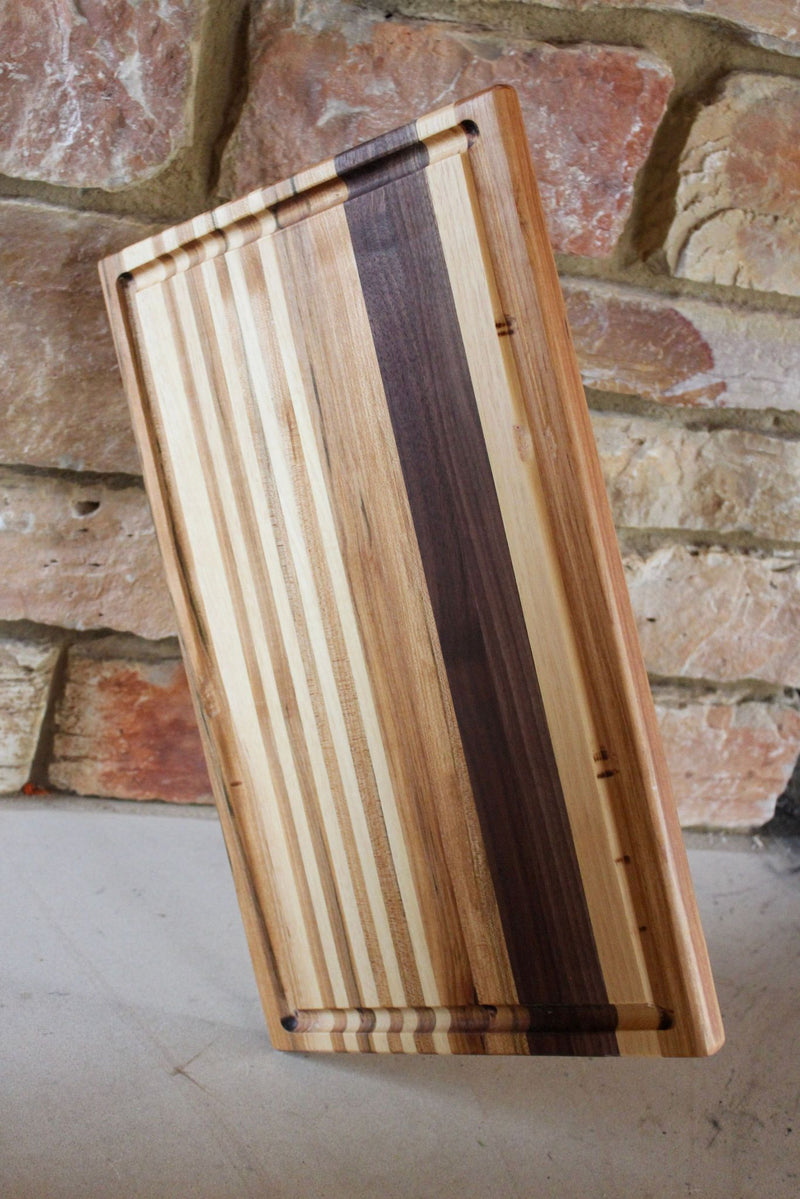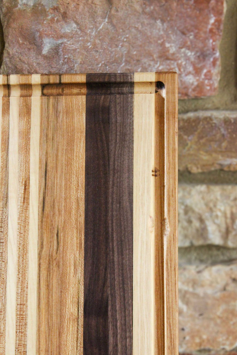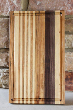 Elevate your kitchen with The Wingra, a stunning cutting board meticulously handcrafted from premium Walnut, Maple, and Cherry woods. This edge grain cutting board features a practical juice groove, ensuring your countertops stay clean while you prep your favorite meals.